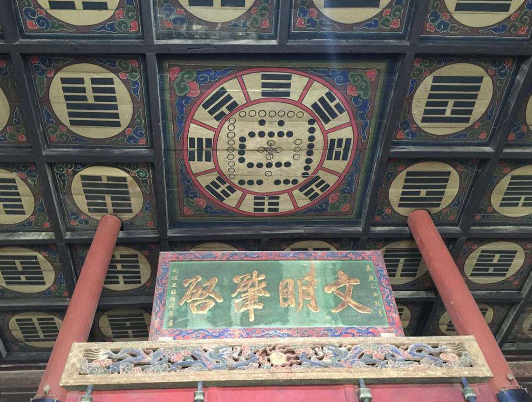 先天殿為主殿,門楣上高懸“一畫開天”匾額。一進殿內(nèi)迎面而來的是一尊3米多高伏羲圣像,抬頭望去是伏羲六十四卦卦象圖。圣像的右側(cè)是龍馬雕像,左側(cè)為河圖洛書石盤等。殿內(nèi)的裝飾無不與伏羲氏一生的作為密切相關。傳說伏羲廟各院有64株古柏,按照伏羲六十四卦種植的,不過現(xiàn)在還存有的只有37株了。先天殿后面為太極殿,又稱退殿、寢殿、寢宮,依“前宮后寢”慣例而建。